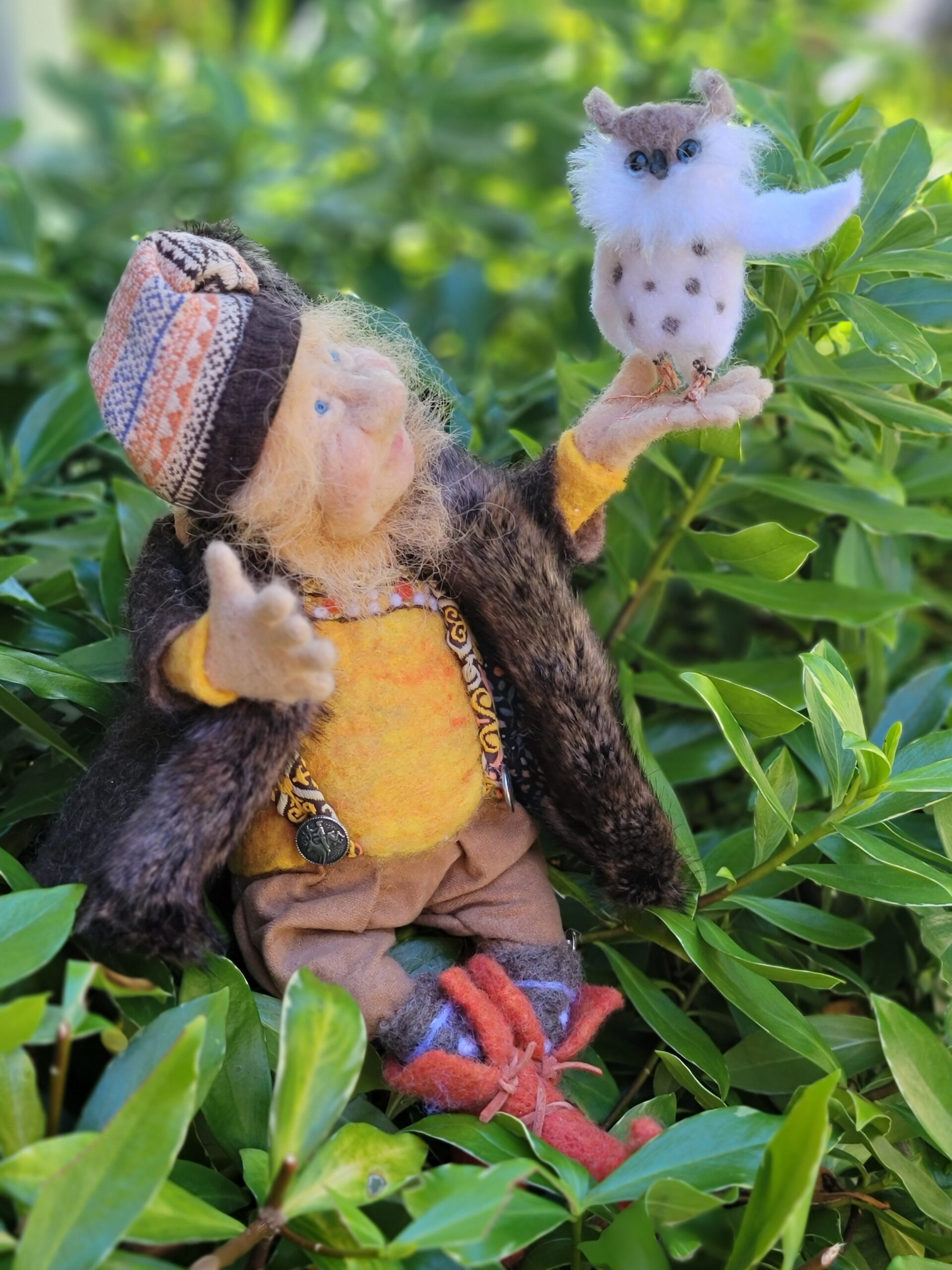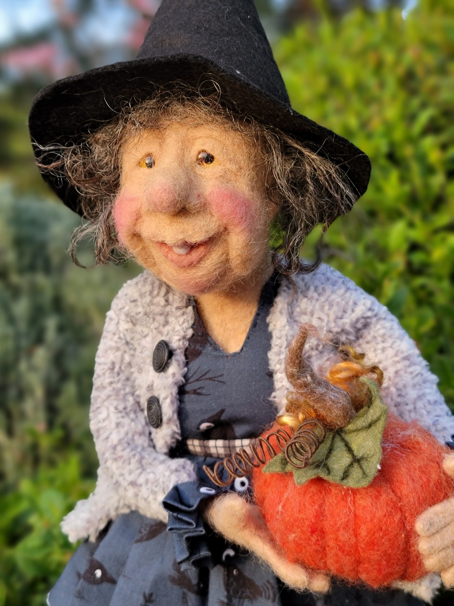My late husband always called me “The Queen Bee”. Carolyn and I collaborated on what I was envisioning, and I gathered up a few little rhinestone “blingy” pieces that I hoped she could collaborate into my Woolie. She did a marvelous job of including those pieces, gave her green eyes like mine, and quite a little attitude, which is also right on point. She even has a little stinger! Every time I look at her I smile—she just tickles me to pieces, and is such a visual reminder of my favorite nickname and my husband. Carolyn’s work is stunning, so detailed, so whimsical, and I don’t know how she manages to felt a lovely little soul into each of her pieces, but she does. I feel so lucky to have one of her creations